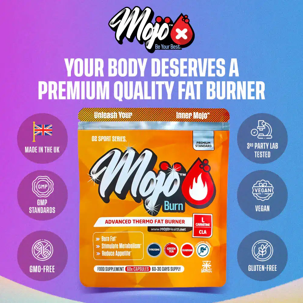 MOJO™ Burn 🔥 isn’t just another run-of-the-mill fat burner; it’s a precision-engineered formula designed to kick your metabolism into overdrive. With a synergistic blend of 💪 T5 Metabolism Boosters, 🏋️♂️ L-Carnitine, 🧠 L-Tyrosine, 🍵 Green Tea, 🌿 Siberian Ginseng, 🍽️ Chromium Picolinate (Appetite Suppressant), 🥛 CLA (Conjugated Linoleic Acid), and ☕ Guarana Extract, it’s like giving your metabolism a turbo boost, turning it into a relentless fat-burning machine. So, if you’re looking for a fat burner that doesn’t mess around, MOJO™ Burn is your go-to.