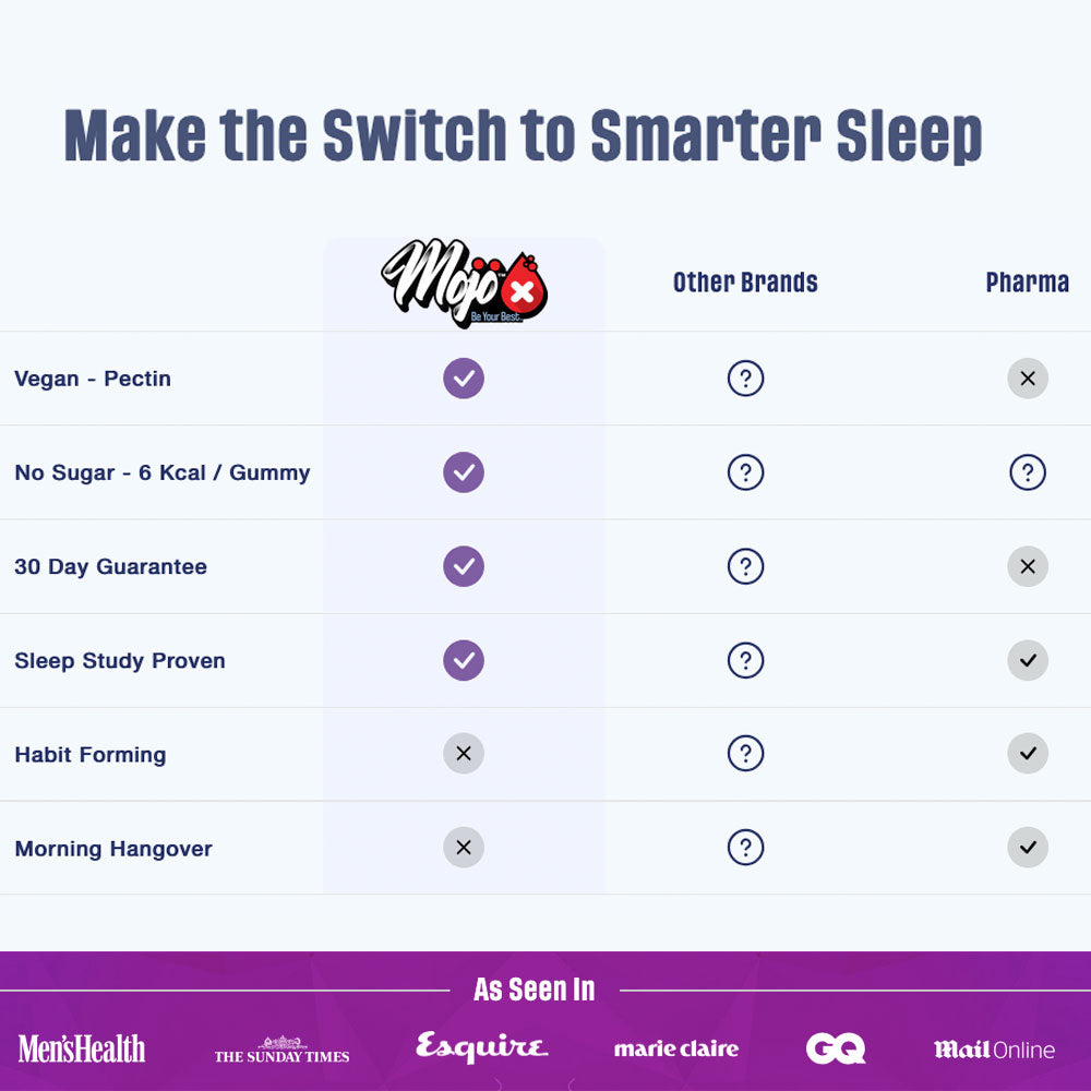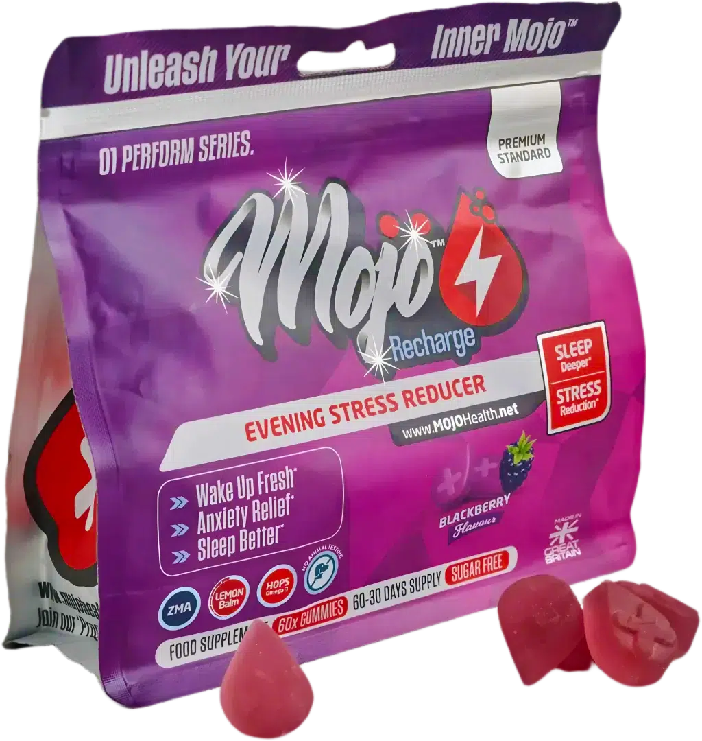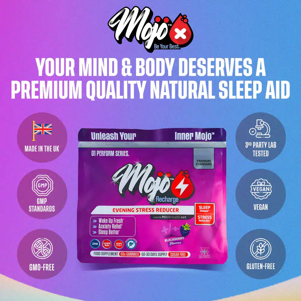 MOJO™ Recharge Sleep Gummies combine Melatonin, L-tryptophan, L-Theanine, Chamomile, Hops, and Valerian to promote restful sleep, reduce anxiety, and improve mood. 🌿 These gummies support deep, uninterrupted sleep, enhance cognitive function, and help you wake up feeling refreshed and energised. 💪 With a gentle, non-drowsy formula, they are perfect for nightly use. 🌟