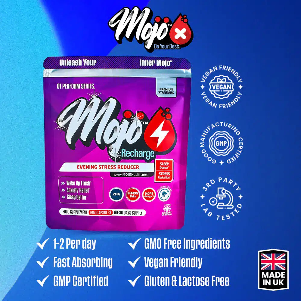 MOJO™ Recharge Sleep capsules combine Melatonin, L-tryptophan, L-Theanine, Chamomile, Hops, and Valerian to promote restful sleep, reduce anxiety, and improve mood. 🌿 MOJO™ Recharge Sleep capsules support deep, uninterrupted sleep, enhance cognitive function, and help you wake up feeling refreshed and energised. 💪 With a gentle, non-drowsy formula, they are perfect for nightly use. 🌟